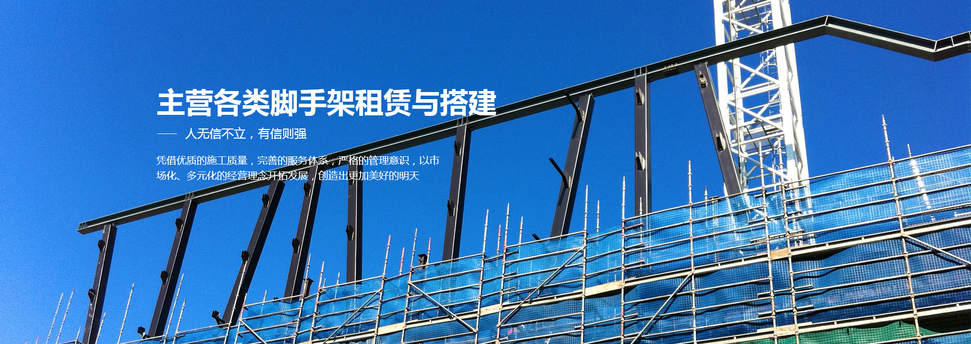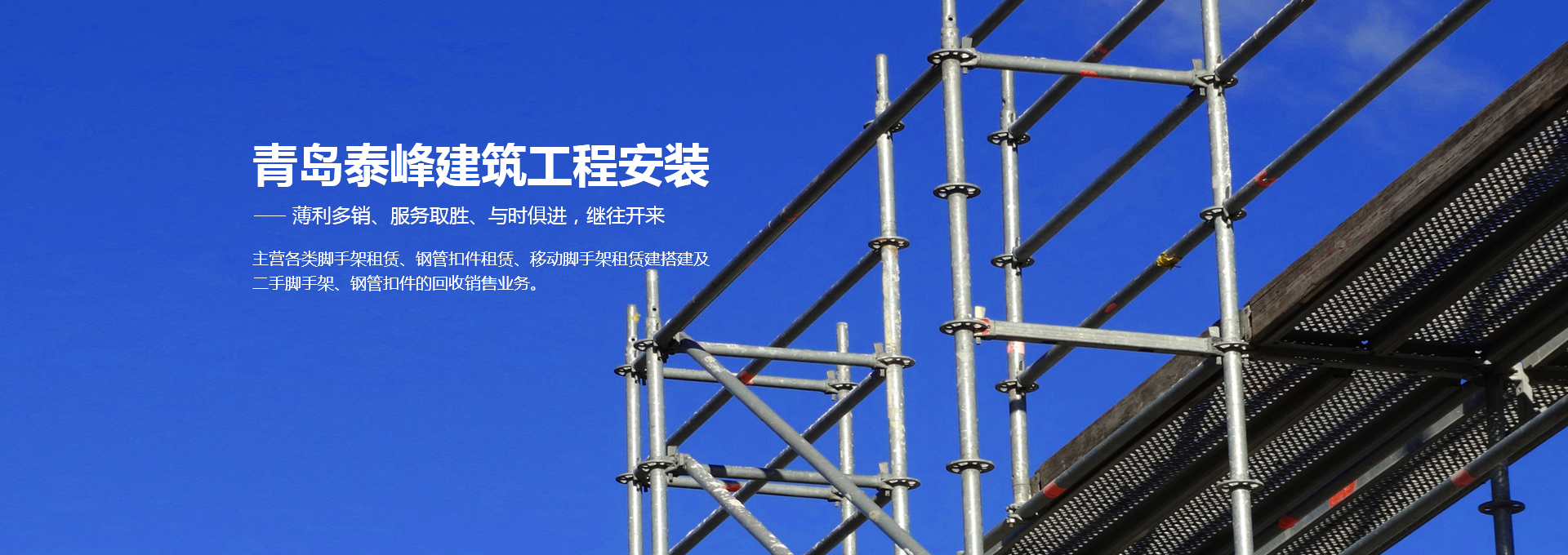 青島泰峰建筑工程安裝有限公司主營各類腳手架租賃、鋼管扣件租賃、移動腳手架租賃建搭建及二手腳手架、鋼管扣件的回收銷售業(yè)務(wù)。公司實(shí)力雄厚,擁有鋼管約3000噸、扣件70萬只、鋼笆7萬多片塔吊、人貨電梯多臺;總資產(chǎn)達(dá)到1000多萬元。是一家具有腳手架搭建、水電安裝專業(yè)承包施工資質(zhì)的企業(yè),并成為青島市五金協(xié)會的會員單位。且多次參與高層建筑、建筑裝修、玻璃幕墻、橋梁、隧道、地鐵、電廠維修施工、造船等行業(yè)的施工,并獲得施工單位的一致好評。 人無信不立,有信則強(qiáng)公司以“薄利多銷、服務(wù)取勝”為經(jīng)營宗旨...